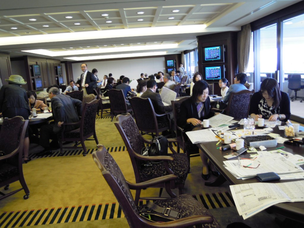 来賓室内の様子。みな、黙々と次のレースの馬券を検討。